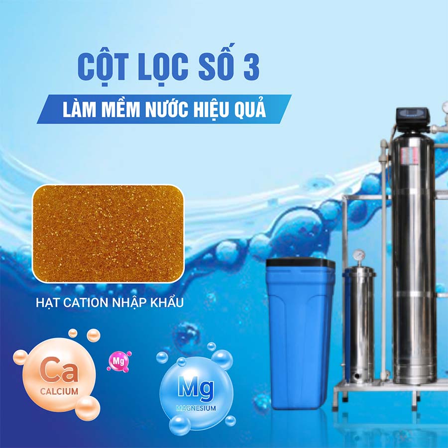 Ứng dụng công nghệ trao đổi ion hiện đại, cột lọc này sử dụng vật liệu lọc là các hạt Cation nhập khẩu 100% từ Italia. Những hạt Cation này có khả năng hấp thụ các ion kim loại gây cứng nước như Ca²⁺ và Mg²⁺, từ đó giúp giảm thiểu cặn vôi, ngăn ngừa đóng cặn đường ống, thiết bị gia dụng và bề mặt gạch men trong nhà.