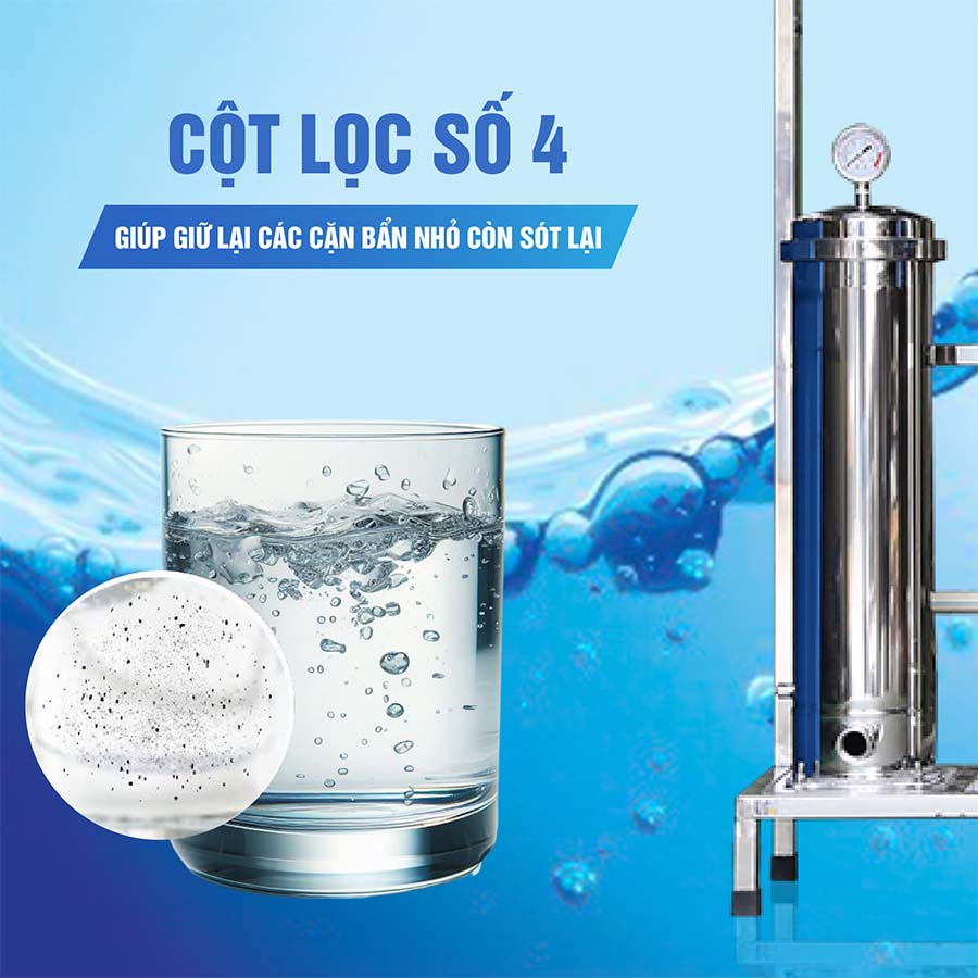 Sau khi nước đã được xử lý qua ba cột lọc chính, cột lọc PP chặn đóng vai trò như một lớp lọc cuối cùng giúp giữ lại các cặn bẩn nhỏ còn sót lại, cũng như ngăn chặn vật liệu lọc có thể theo dòng nước thoát ra ngoài.