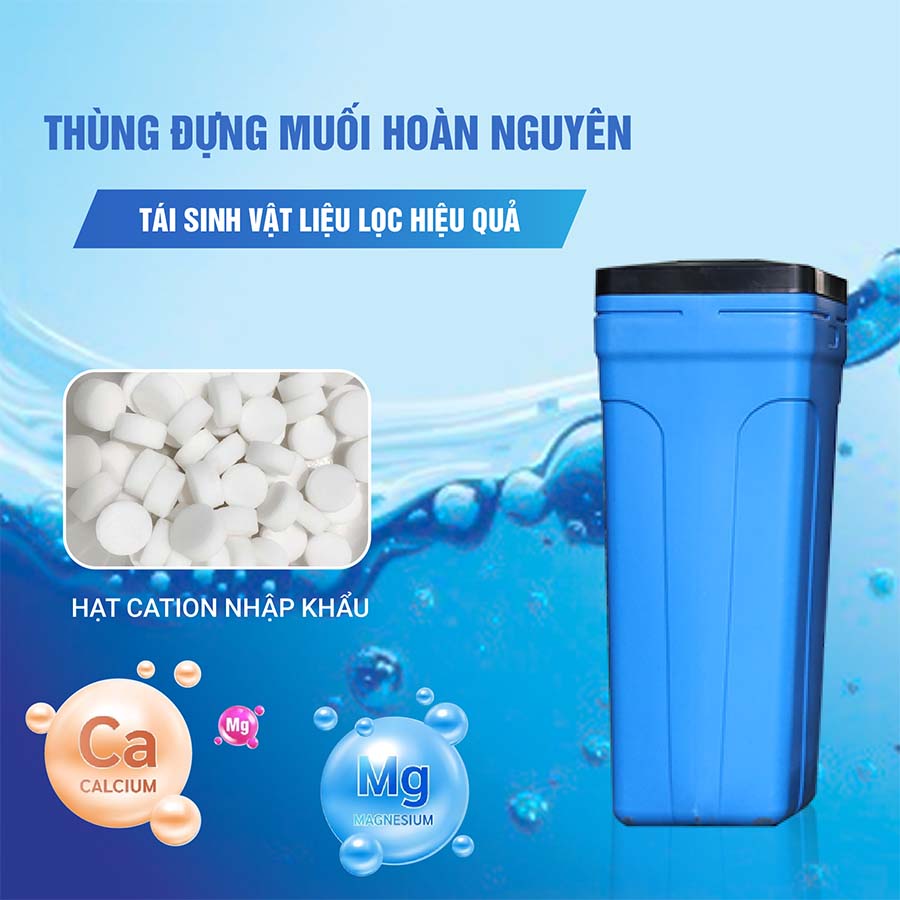 Đặc biệt, thùng muối này được thiết kế kèm bộ lọc muối bên trong, giúp ngăn ngừa tình trạng tắc ống dẫn hay bẩn van điều khiển, đảm bảo quy trình tái sinh luôn diễn ra trơn tru, ổn định và hiệu quả.