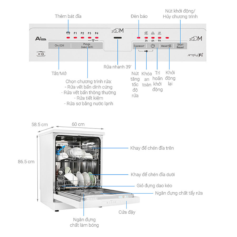 • Số chén bát rửa được: 3 – 4 bữa ăn Việt (13 bộ Châu Âu)