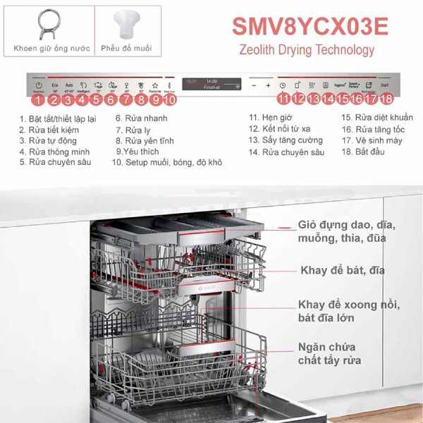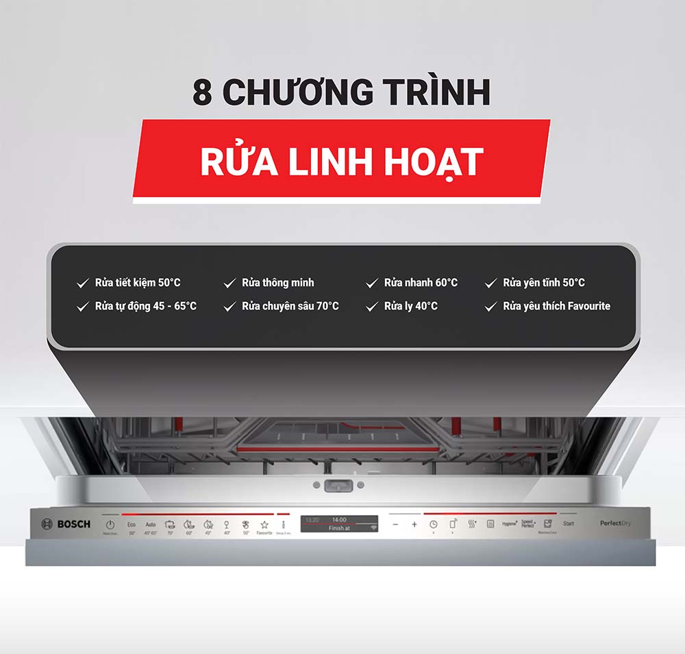 Máy rửa bát Bosch SMV8YCX03E tích hợp 8 chương trình rửa đa dạng: