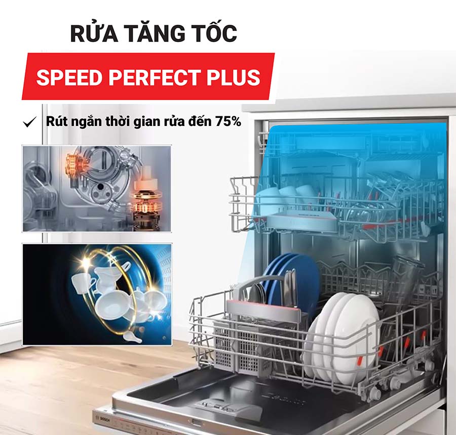 Với chức năng Speed Perfect Plus, máy rửa bát SMV8YCX03E có thể rút ngắn thời gian rửa đến 75% so với bình thường mà vẫn đảm bảo hiệu quả làm sạch tối ưu nhờ tăng nhiệt độ và áp lực nước.