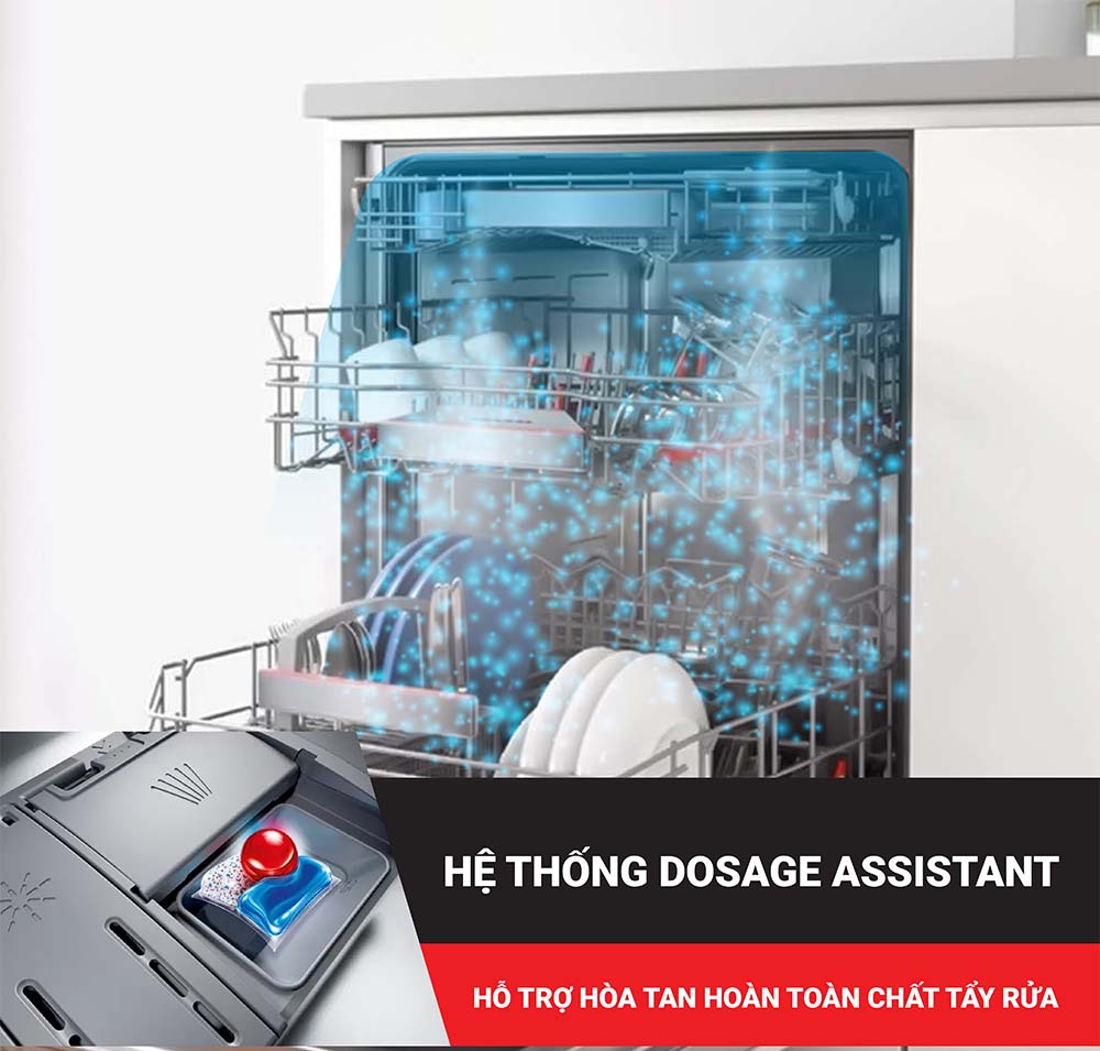 Chức năng Dosage Assistant trên máy rửa bát Bosch SMV8YCX03E giúp tối ưu hóa quá trình làm sạch bằng cách hỗ trợ hòa tan hoàn toàn và tự động định lượng chất tẩy rửa, phân phối đều khắp khoang rửa. Nhờ đó, giúp loại bỏ nhanh chóng các vết bẩn cứng đầu.