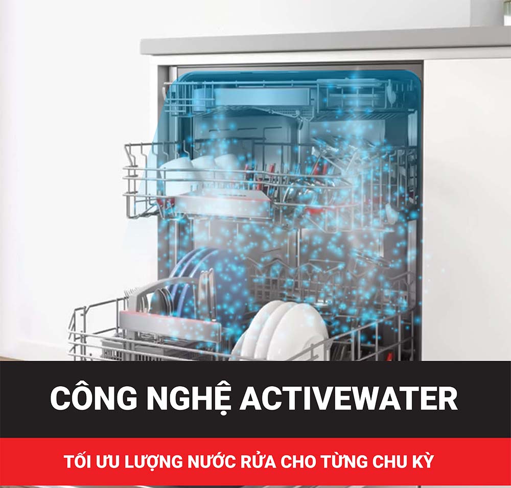 Công nghệ ActiveWater giúp máy rửa bát tự động điều chỉnh lượng nước sử dụng. Sau mỗi chu trình rửa, máy sẽ đánh giá độ sạch của nước để quyết định có tái sử dụng được hay không. Đồng thời, máy còn căn chỉnh lượng nước phun phù hợp với số lượng bát đĩa, giúp tiết kiệm tối đa lượng nước tiêu thụ.