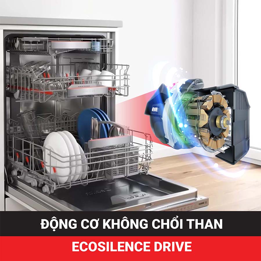 Máy rửa bát SMV8YCX03E được trang bị động cơ không chổi than EcoSilence Drive. Động cơ này có công suất hoạt động mạnh mẽ, nhưng lại rất êm ái với độ ồn chỉ ở mức 43dB như tiếng nói chuyện thì thầm, không ảnh hưởng đến không gian sinh hoạt chung của gia đình.