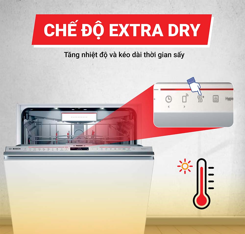 Máy rửa bát sẽ tăng nhiệt độ và kéo dài thời gian sấy so với các chương trình rửa thông thường. Nhờ đó, bát đĩa sẽ được sấy khô hơn, không còn hiện tượng đọng nước trong khoang rửa.