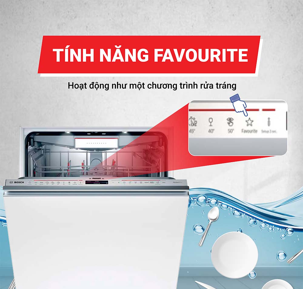Khi ở chế độ mặc định thì chương trình yêu thích được mặc định là chương trình rửa tráng 15 phút. Bên cạnh đó, chương trình Favourite còn cho phép kết hợp 1 chức năng cơ bản và tính năng đặc biệt trong một nút ấn. Lần sau, khi muốn sử dụng lại, bạn chỉ cần chọn chế độ Favourite, máy sẽ tự động thực hiện cả hai tùy chọn đã chọn trước đó.