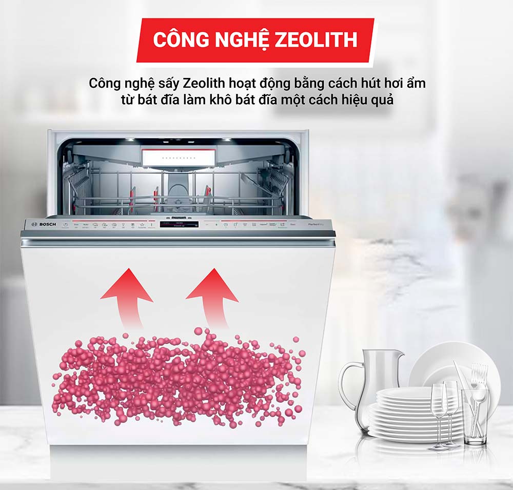 Công nghệ sấy Zeolith trên máy rửa bát Bosch hoạt động bằng cách hút hơi ẩm từ bát đĩa vào một khoang chứa đầy khoáng chất Zeolith. Khi tiếp xúc với khoáng chất này, hơi nước sẽ biến thành hơi nóng và được thổi ngược trở lại khoang rửa làm khô bát đĩa. Nhờ đó, bát đĩa sẽ sạch bóng và khô hơn. Đồng thời còn tiết kiệm năng lượng hiệu quả.