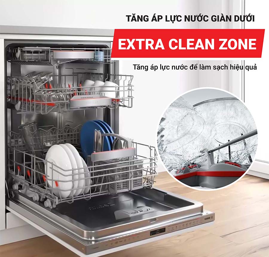 Với chén bát, đồ dùng xếp ở giàn giữa, hệ thống vòi phun Extra Clean Zone sẽ tăng áp lực nước để làm sạch hiệu quả.
