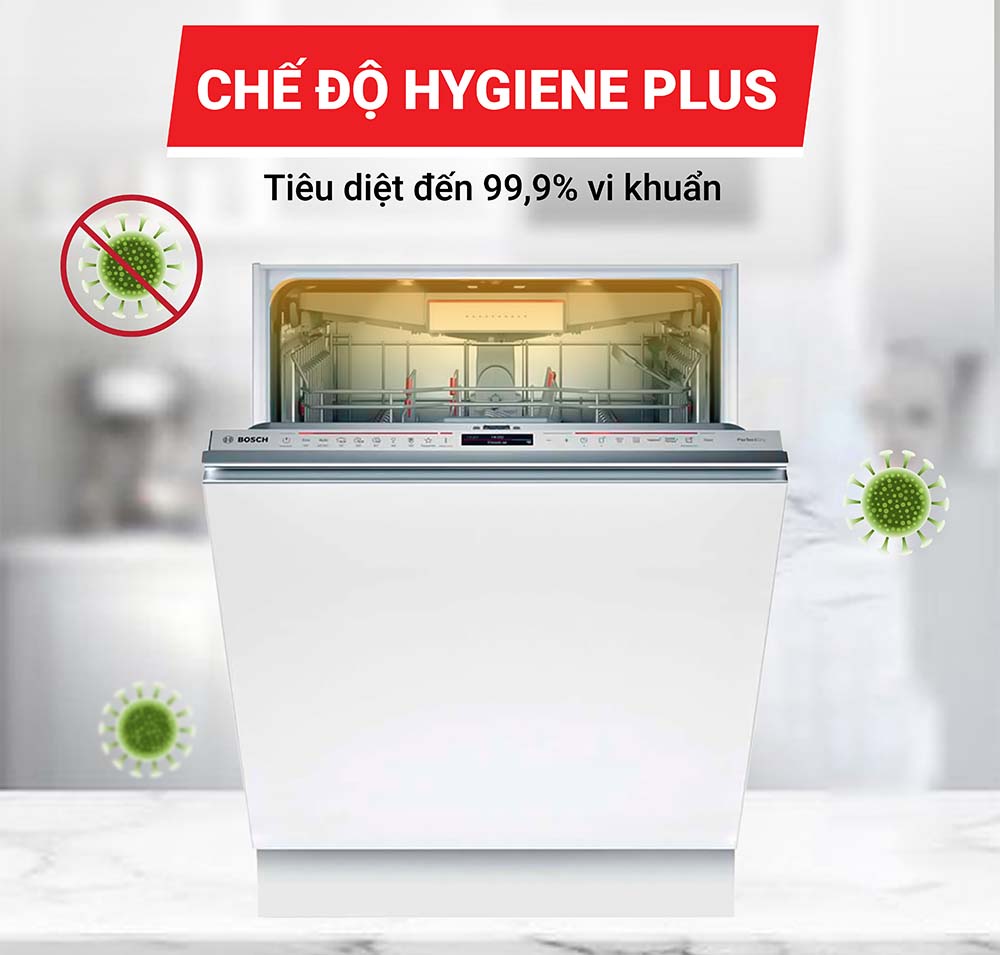 Máy rửa chén Bosch SMV8YCX03E tích hợp chế độ Hygiene Plus. Chương trình này sẽ nâng nhiệt độ nước lên đến 70°C và duy trì trong 10 phút, giúp tiêu diệt đến 99,9% vi khuẩn  và nấm mốc sinh sôi. Nhờ đó, bát đĩa sẽ sạch thơm hơn. Đặc biệt, tính năng này rất thích hợp khi muốn rửa diệt khuẩn bình sữa trẻ em, đồ nấu thức ăn dặm cho bé.