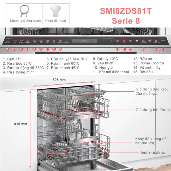 Với kích thước tiêu chuẩn 815 x 598 x 573 mm (Cao x Rộng x Sâu) và trọng lượng 48,1 kg, Bosch SMI8ZDS81T dễ dàng lắp đặt gọn gàng trong các hệ tủ bếp hiện đại. Thiết kế tối ưu này không chỉ tiết kiệm diện tích mà còn góp phần tạo nên một không gian bếp gọn gàng, tiện nghi và đầy đẳng cấp.
