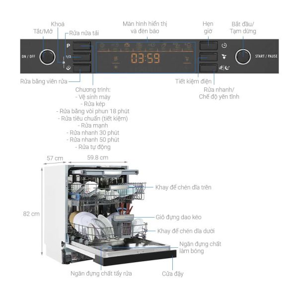 • Chức năng khóa trẻ em: Khi được kích hoạt, chức năng này sẽ vô hiệu hóa toàn bộ bảng điều khiển, ngăn trẻ nhỏ khỏi việc thay đổi các cài đặt trước đó bằng việc tình cờ bấm vào. Điều này đảm bảo an toàn cho trẻ nhỏ khi chơi đùa xung quanh máy rửa chén.