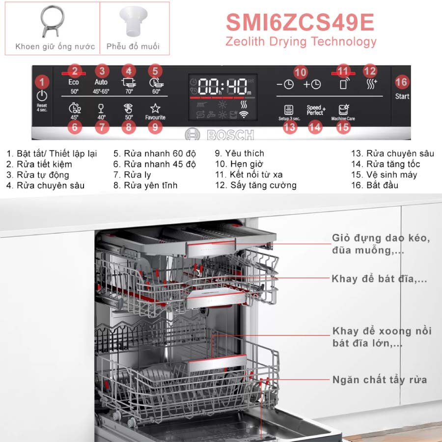 - 4 tính năng rửa thêm: Home Connect, tăng tốc, sấy thêm, vùng rửa mạnh