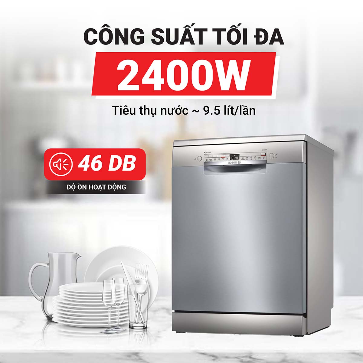 - Máy rửa chén Bosch tích hợp động cơ không chổi than cho hiệu suất cao mà độ ồn được giảm thiểu tối đa với mức ồn chỉ 46 dB tương đương tiếng thì thầm, tiếng mưa vừa phải, đảm bảo sự thoải mái cho mọi người khi máy chạy, bé yêu và cả những vật cưng của bạn cũng sẽ luôn ngủ ngon giấc.