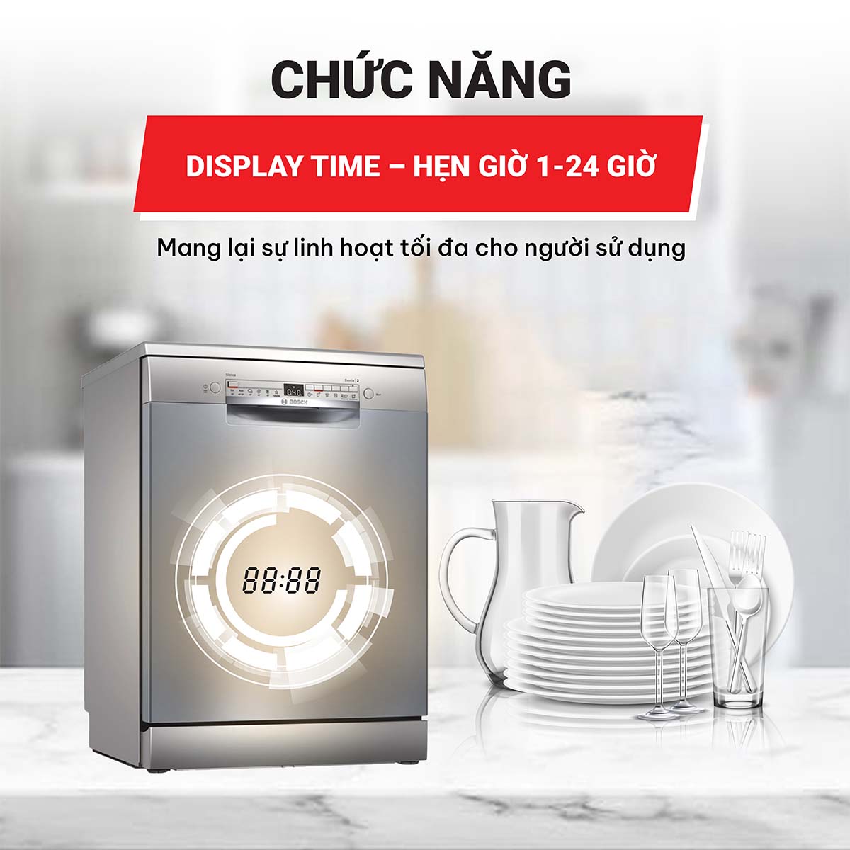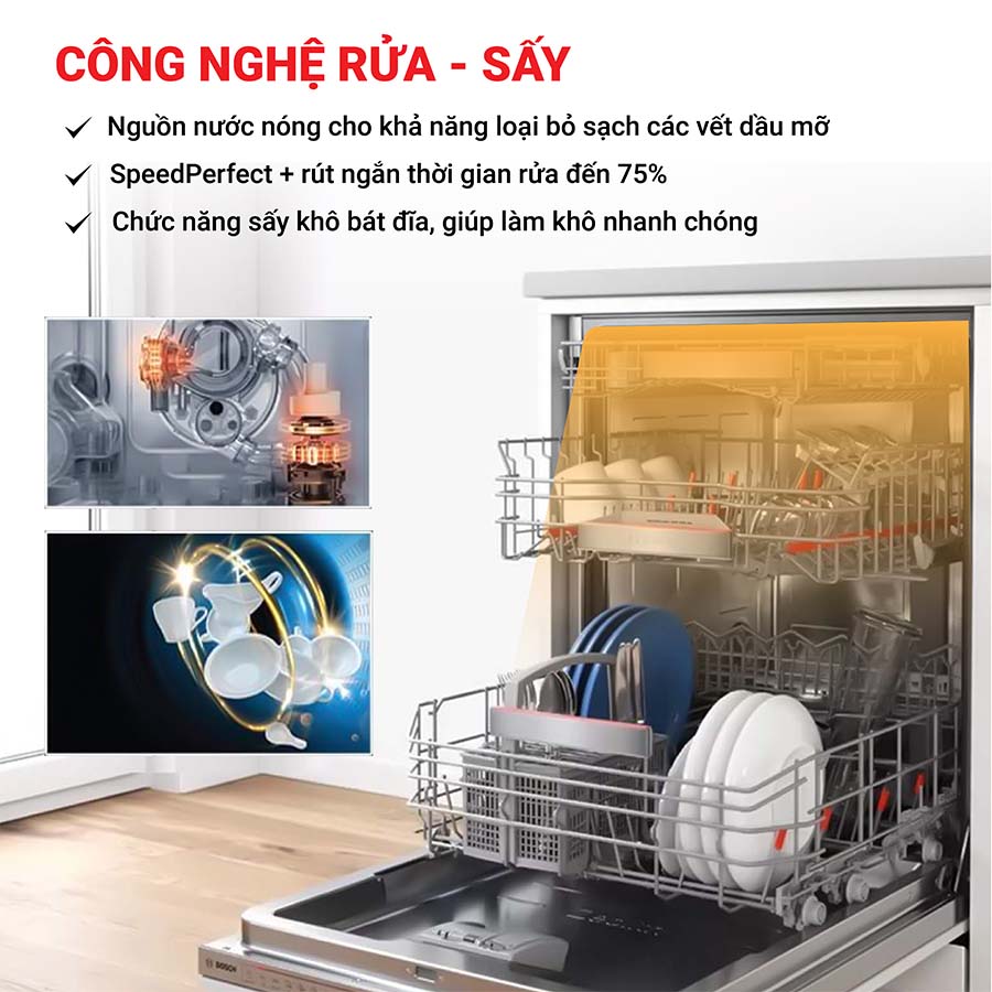- Máy rửa chén độc lập Bosch SMS2HAI12E có chức năng sấy khô bát đĩa, giúp làm khô nhanh chóng sau mỗi lần rửa, tiết kiệm thời gian chờ đợi, bảo vệ sức khỏe gia đình nhờ việc loại bỏ vi khuẩn, mùi hôi kể cả khi bạn để quên chén bát trong máy.