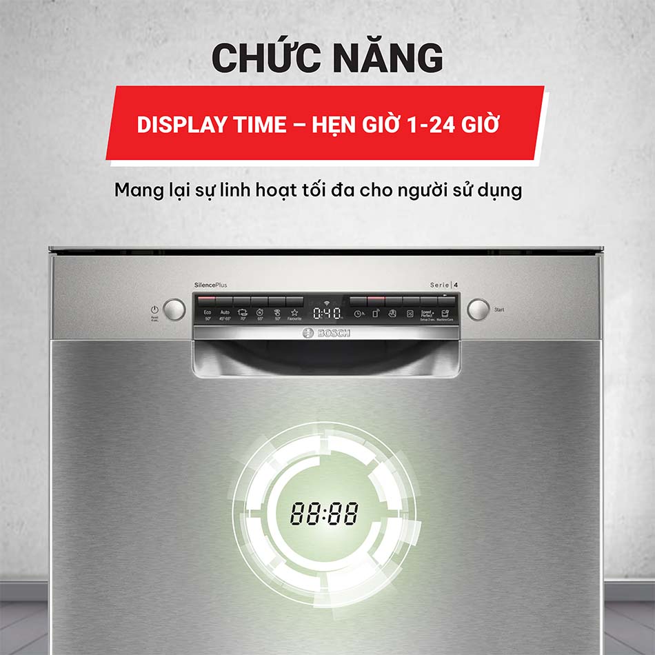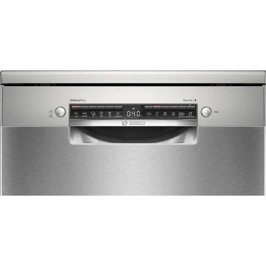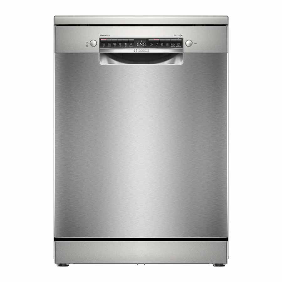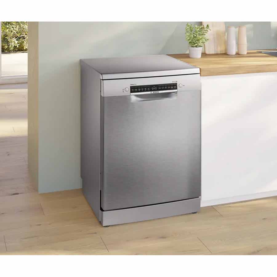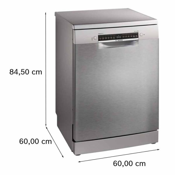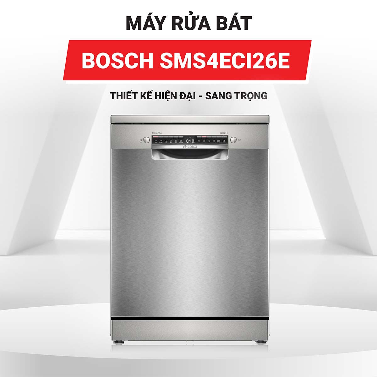 - Bosch SMS4ECI26E mang ngoại hình đơn giản với hình chữ nhật đứng chắc chắn, gam màu bạc trang nhã phối hợp hài hòa với các món đồ nội thất khác trong gian bếp gia đình bạn. Với kiểu máy rửa chén độc lập, bạn có thể chọn lắp đặt ở cạnh kệ bếp hoặc đặt bên trong tủ bếp đều được.