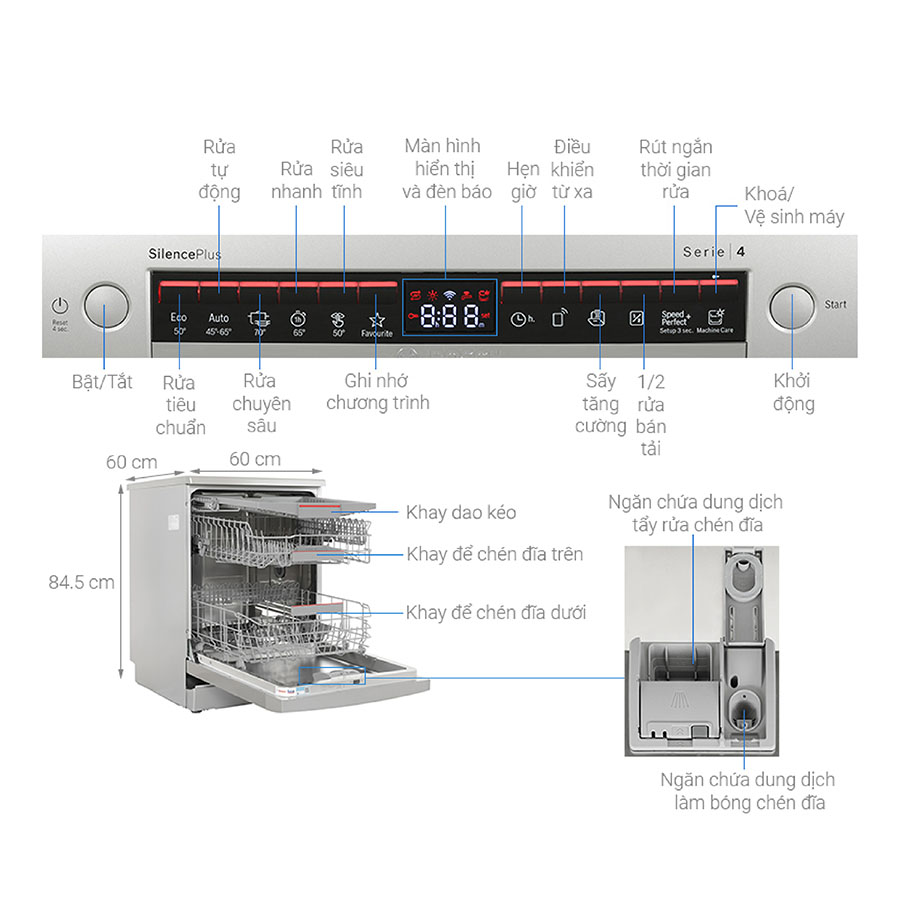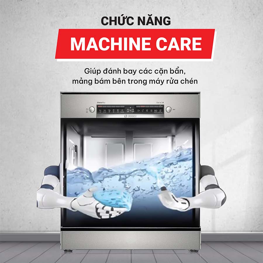 - Machine Care: chức năng giúp đánh bay các cặn bẩn, mảng bám bên trong máy rửa chén để không gian trong máy luôn sạch sẽ, bảo vệ chén bát của bạn khỏi sự tấn công của vi khuẩn có hại.