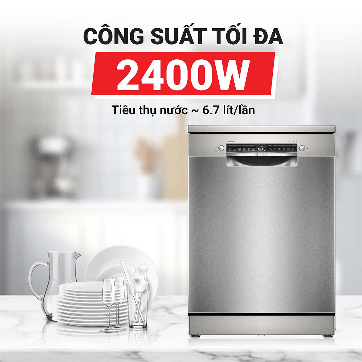 Máy rửa chén độc lập Bosch SMS4ECI26E hoạt động với công suất mạnh mẽ 2400W rửa được cùng lúc lượng chén bát tương đương 3 – 4 bữa ăn Việt, cài đặt 6 chương trình rửa dễ dàng lựa chọn tùy theo nhu cầu, hỗ trợ công nghệ rửa nước nóng giúp diệt khuẩn tối ưu, công nghệ Heat exchanger + Drying assist giúp sấy khô chén đĩa dễ dàng.