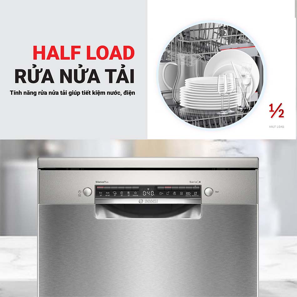 - Rửa nửa tải Half load: Đây là chế độ hoàn hảo cho những lúc số lượng bát đĩa quá ít mà bạn muốn rửa ngay. Khi kích hoạt chương trình Half Load, chỉ một phần máy hoạt động, máy chỉ rửa trên 1 cánh tay phun còn 1 tay phun khác sẽ được tạm ngưng (có thể là giàn rửa trên hoặc dưới), nhằm giảm lượng nước và năng lượng tiêu thụ cần thiết. Ngoài ra, một số dòng seri sau này có sự cải tiến khi sử dụng đồng thời cả 2 tay phun nhưng với lượng điện nước giảm đáng kể so với các chế độ rửa thông thường.
