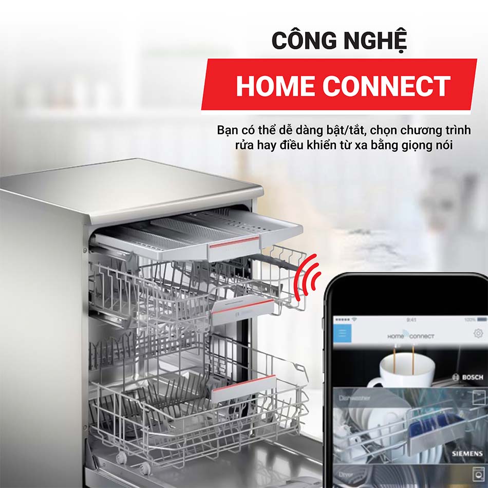 - Điều khiển bằng điện thoại thông qua ứng dụng Home Connect: sau khi cài đặt ứng dụng này vào điện thoại hoặc máy tính bảng và liên kết với máy rửa chén, bạn có thể điều khiển thiết bị dễ dàng mà không cần trực tiếp thao tác trên máy.