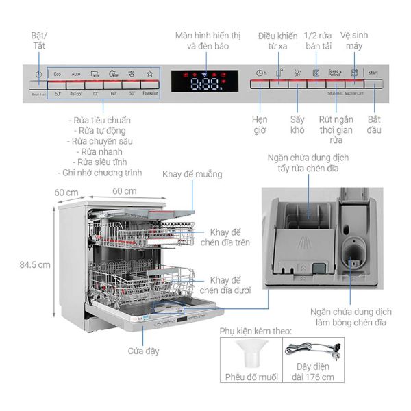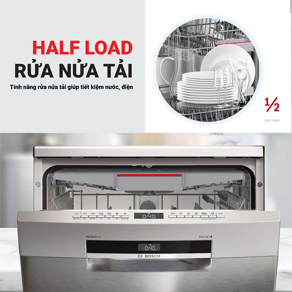 - Rửa nửa tải (Half Load): Giúp máy rửa chén làm việc với 1/2 công suất và tiêu thụ điện nước ít hơn, phù hợp cho việc rửa chén bát với số lượng ít.
