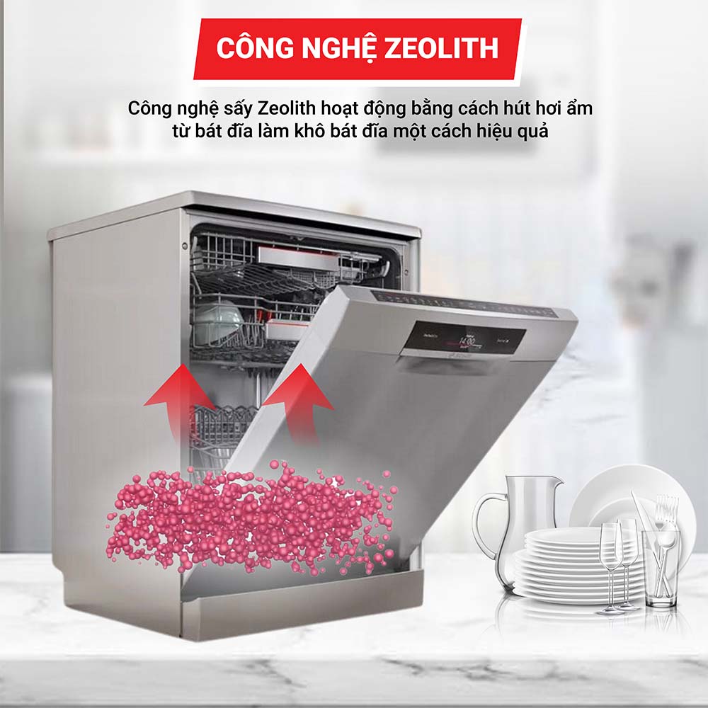 Công nghệ sấy khô Zeolith: Các hạt Clever Zeolith sẽ hút độ ẩm và sinh ra không khí nóng để thổi ngược lại bên trong khoang chính, giúp sấy khô chén bát cực nhanh mà lại tiêu tốn điện năng thấp nhất có thể (tiết kiệm đến 20%). Đặc biệt công nghệ sấy khô này hoàn toàn không ảnh hưởng đến các vật dụng bằng thuỷ tinh, pha lê.