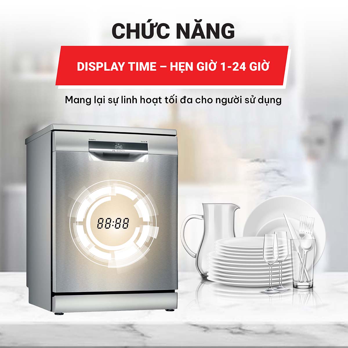 - Hẹn giờ bắt đầu rửa: Giúp bạn chủ động linh hoạt cài đặt thời gian bắt đầu rửa chén theo nhu cầu sử dụng, từ 1 – 24 tiếng.