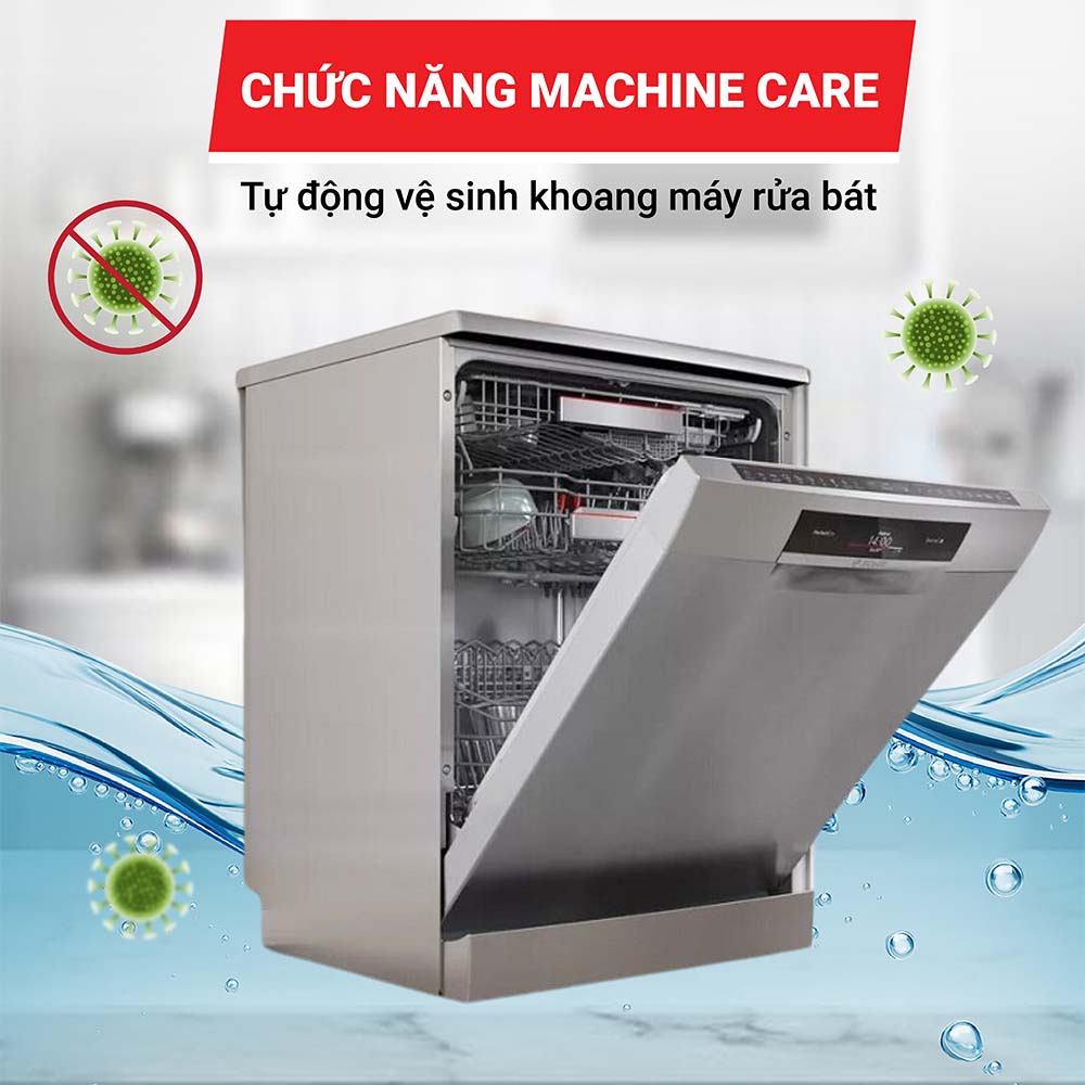 - Chức năng vệ sinh máy Machine care: Loại bỏ các mảng bám thức ăn còn sót lại, nấm mốc, vi khuẩn và bụi bẩn bên trong khay chứa, nhờ đó nâng cao hiệu quả rửa chén và duy trì độ bền tốt cho máy.