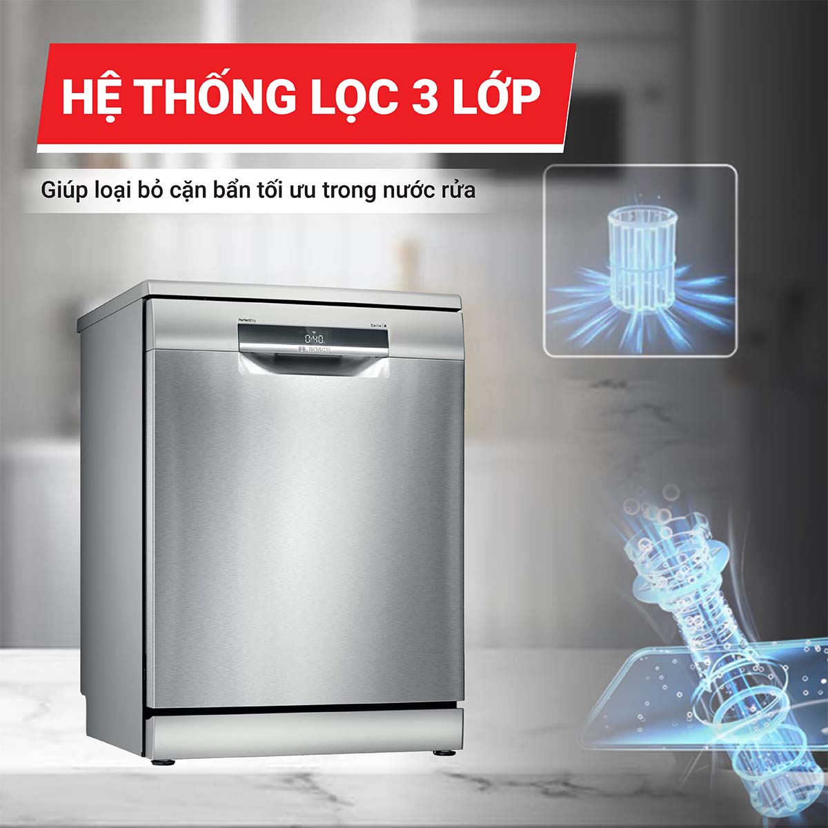 - Hệ thống lọc 3 lớp tối ưu lượng nước sử dụng: Giúp loại bỏ cặn bẩn tối ưu trong nước rửa, nhằm nâng cao hiệu quả rửa chén và giảm thiểu tình trạng hư hỏng máy.