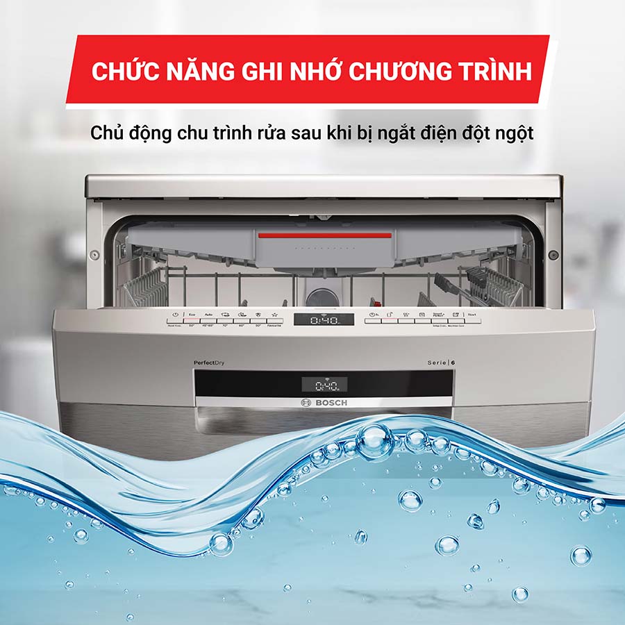 Máy rửa chén độc lập Bosch này được thiết kế 6 chương trình rửa, thuận tiện cho bạn lựa chọn theo nhu cầu sử dụng. Cụ thể là: rửa chuyên sâu (Intensive), rửa tự động (Auto), rửa tiêu chuẩn (Eco), rửa siêu tĩnh (Silence 50), rửa nhanh (Express 60 độ), yêu thích (Favourite).