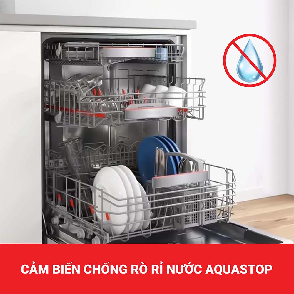 Aqua Stop của Bosch bao gồm một van điện tử trên ống dẫn nước và một hệ thống cảm biến trong máy. Hệ thống cảm biến liên tục theo dõi tình trạng của thiết bị, và sẽ tự động đóng lại van điện tử, ngắt nguồn cấp nước ngay lập tức khi phát hiện có sự rò rỉ nước trong khoang máy hoặc trên đường ống, đảm bảo an toàn cho thiết bị và ngôi nhà của bạn.