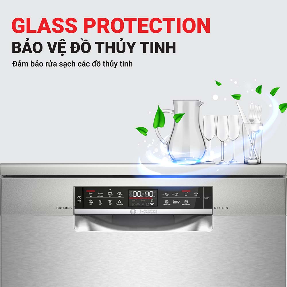 Công nghệ Glass Protection được trang bị trên máy rửa bát giúp việc xử lý nhẹ nhàng kính, thủy tinh và sứ cao cấp của bạn. Nước có độ mềm lớn có thể ăn mòn kính và thủy tinh, công nghệ bảo vệ bằng kính của Bosch đảm bảo độ cứng của nước bên trong máy rửa bát (chén) được duy trì trong phạm vi yêu cầu. Với tính năng này, bạn có thể yên tâm rằng những chiếc ly thủy tinh và đồ sứ quý giá của bạn luôn được rửa sạch với sự chăm sóc đặc biệt.
