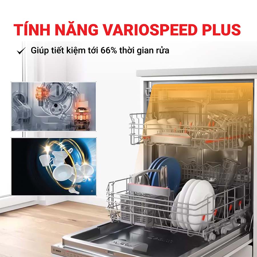 Máy rửa bát độc lập Bosch SMS6ZCI42E trang bị tính năng VarioSpeed Plus giúp tiết kiệm tới 66% thời gian rửa của chương trình (tùy vào từng chương trình khác nhau). Nhờ đó, bát đĩa được làm sạch gấp 3 lần với hiệu quả làm sạch hoàn hảo, thao tác vô cùng đơn giản – chỉ cần bằng một nút chạm.