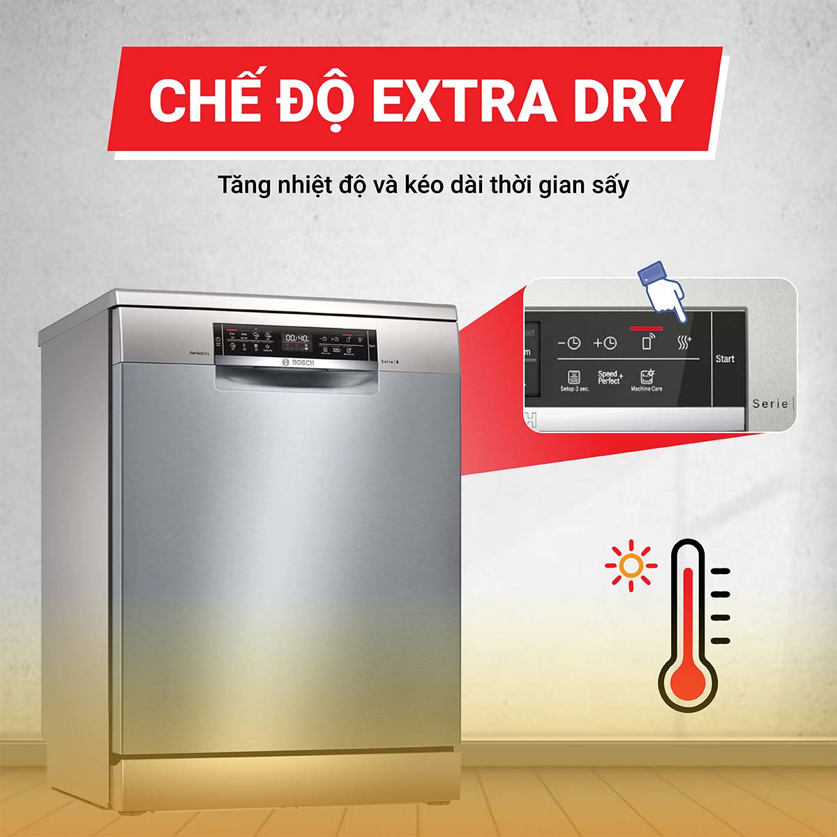 Tính năng ExtraDry của máy rửa bát được sử dụng để làm tăng công suất sấy. Với tính năng bổ sung này các vật dụng bằng nhựa không chỉ sạch sẽ, mà còn khô hoàn toàn và có thể sử dụng ngay sau khi chương trình kết thúc. Bạn không cần phải lau lại vật dụng, đồ dùng lại bằng tay.