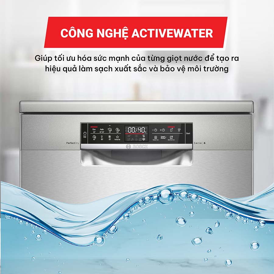 Công nghệ ActiveWater giúp tối ưu hóa sức mạnh của từng giọt nước để tạo ra hiệu quả làm sạch xuất sắc và bảo vệ môi trường. Hệ thống phân phối nước đều khắp toàn bộ khoang rửa, công nghệ lọc được cải tiến, hệ thống sấy khô nhanh hơn và tăng công suất bơm với lưu lượng nước nhiều hơn đảm bảo máy rửa bát BOSCH SMS6ZCI42E làm sạch vật dụng nhanh chóng