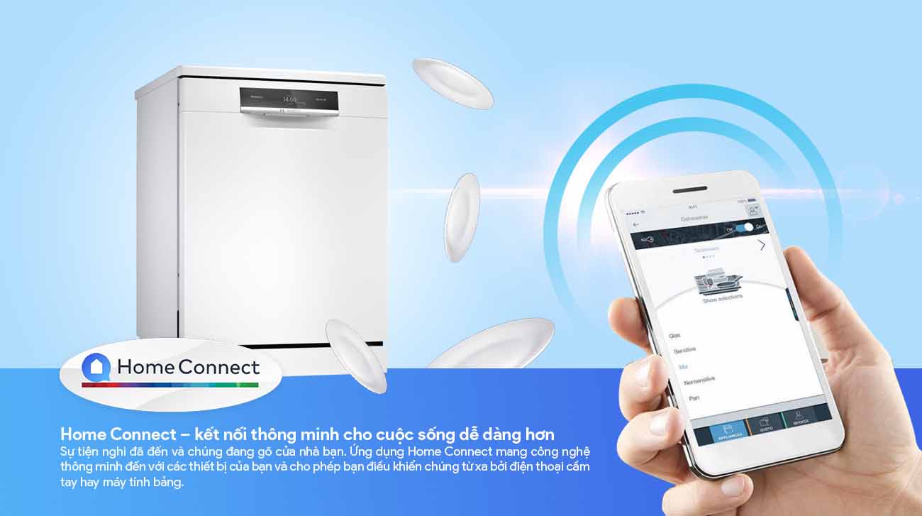 Máy rửa bát độc lập Bosch serie 8 SMS8ZDW48M cho phép người dùng kết nối và điều khiển máy từ xa thông qua ứng dụng Home Connect.