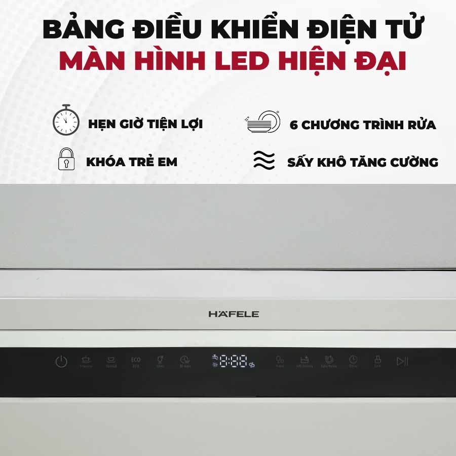 Máy rửa bát để bàn Hafele HDW-T50B 539.20.600 được trang bị 7 chương trình rửa bao gồm: rửa nhanh – 30 phút, rửa đồ thủy tinh – 75 phút, rửa mạnh – 140 phút, rửa thường – 120 phút, rửa tiết kiệm – 195 phút, rửa 90 phút, rửa tự động – 80 phút. Bạn có thể tùy chọn chương trình rửa phù hợp với nhu cầu sử dụng và chất liệu bát đĩa, giúp rửa sạch hiệu quả và tiết kiệm điện nước.