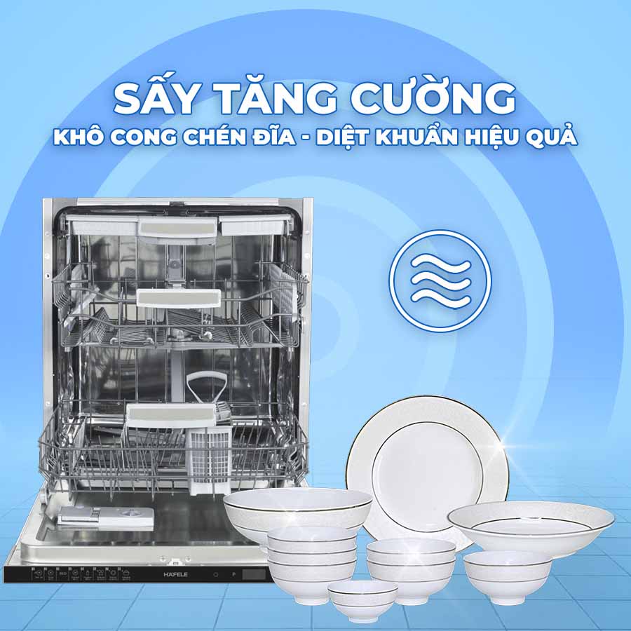 Chức năng sấy tăng cường với chu trình sấy nhiệt 10 phút, giúp diệt khuẩn, bảo vệ chén bát khỏi sự xâm nhập của vi khuẩn, ngăn ngừa tái nhiễm khuẩn và giữ cho đồ dùng luôn sạch sẽ, sáng bóng như mới.