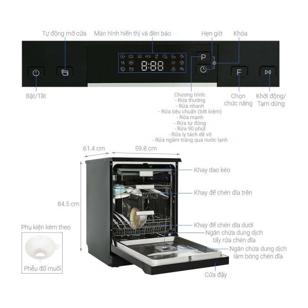 Tự động hé cửa ở cuối chương trình: Sau khi kết thúc chương trình rửa, máy có tính năng tự động hé cửa. Chức năng này giúp thoát hơi nước và tăng tốc độ sấy khô chén bát một cách tự nhiên, đồng thời giảm thiểu lượng nước đọng lại trên bát đĩa, giúp chúng khô ráo và sạch sẽ hơn.