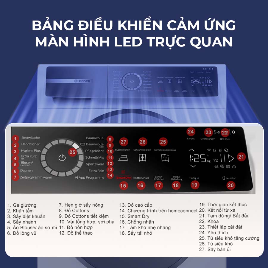 Bảng điều khiển cảm ứng hiện đại dễ sử dụng. Màn hình LED với khả năng hiển thị trực quan giúp cho bạn dễ dàng theo dõi các chương trình của máy hiện đang hoạt động.