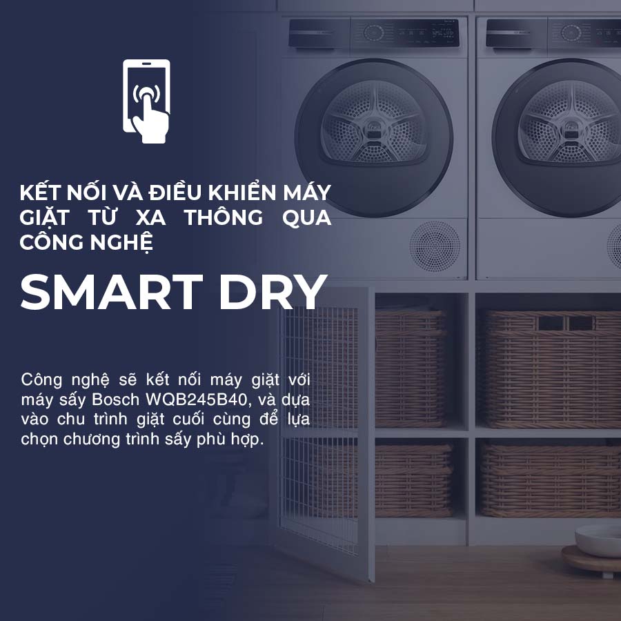 Tính năng SmartDry ra đời để giúp bạn giải quyết vấn đề này. Công nghệ sẽ kết nối máy giặt với máy sấy Bosch WQB245B40, và dựa vào chu trình giặt cuối cùng để lựa chọn chương trình sấy phù hợp.