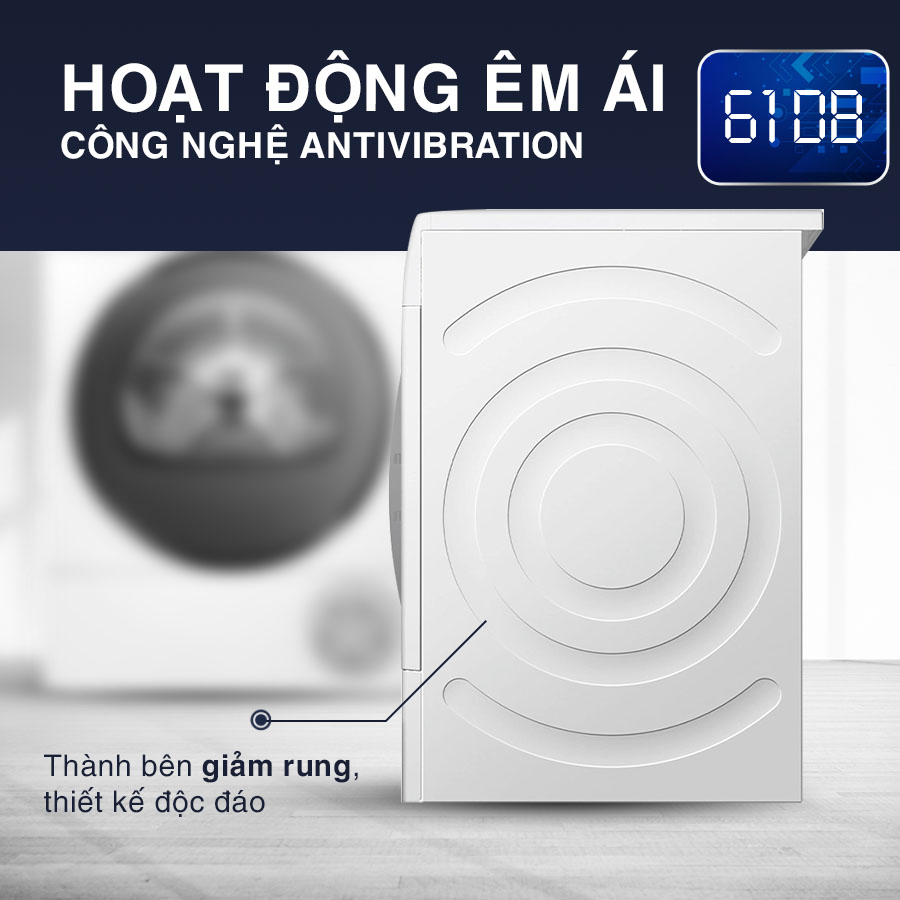 Máy sấy Bosch WQB245B40 với thiết kế AntiVibration không chỉ giúp hai bên thành máy tăng tính thẩm mỹ. Mà hệ thống này còn giúp máy giặt hoạt động ổn định hơn, khả năng chống rung giảm độ ồn của máy trong quá trình sử dụng. Sử dụng lớp cách nhiệt hai bên thành giúp máy hoạt động êm ái và yên tĩnh hơn.