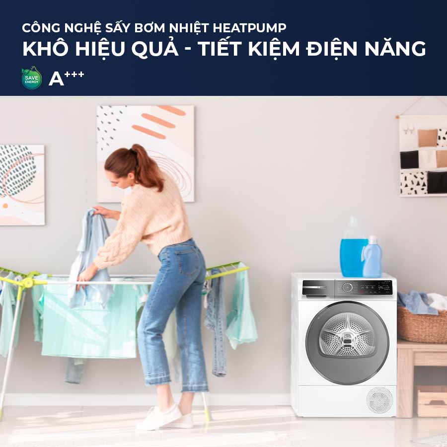 Công nghệ sấy bơm nhiệt Heatpump trên máy sấy Bosch WQB245B40 khiến việc sấy quần áo trở nên dễ dàng hơn, với hiệu quả vượt trội hơn. Thay vì dựa trên sức nóng từ điện trở để sấy quần áo như các loại máy sấy thông thường.