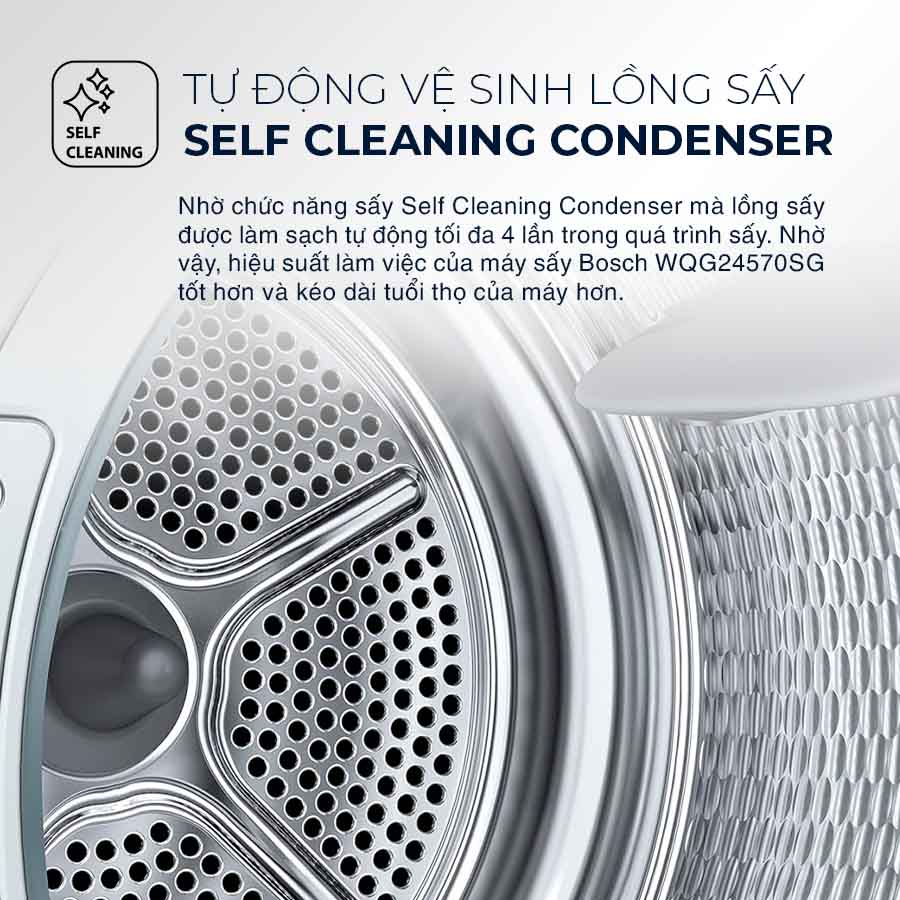 Máy sấy Bosch WQB245B40 serie 8 với chức năng tự làm sạch Self Cleaning Condenser đảm bảo quá trình sấy hiệu quả hơn. Nhờ chức năng sấy Self Cleaning Condenser mà lồng sấy được làm sạch tự động tối đa 4 lần trong quá trình sấy. Nhờ vậy, hiệu suất làm việc của máy sấy Bosch WQG24570SG tốt hơn và kéo dài tuổi thọ của máy hơn.