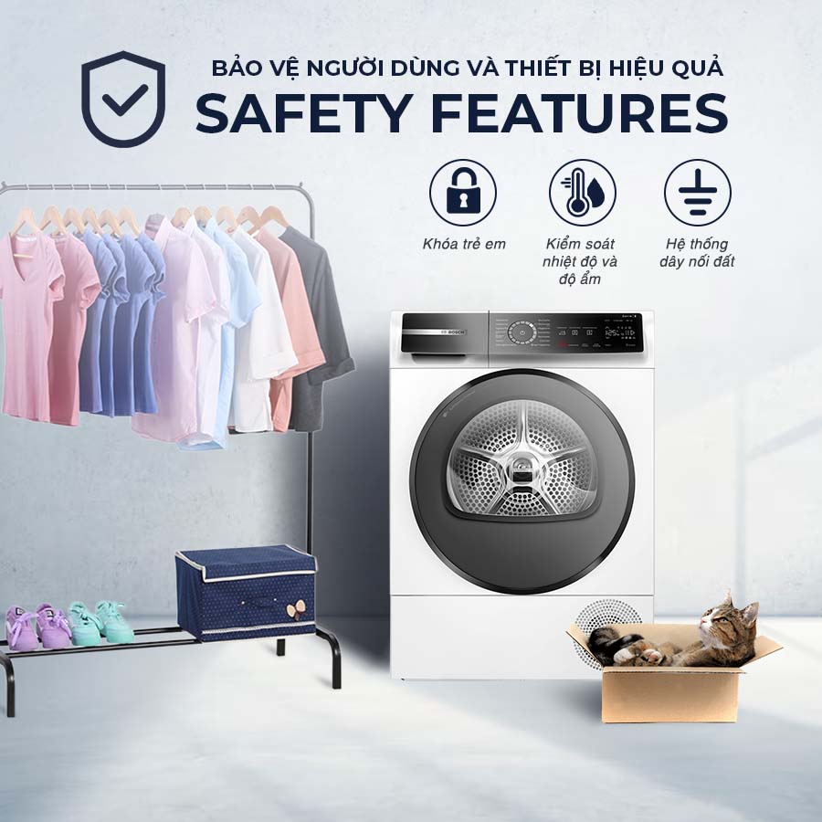 Ngoài những chương trình giặt cơ bản và bổ sung, máy sấy còn tích hợp các tính năng an toàn giúp bảo vệ người dùng và thiết bị: