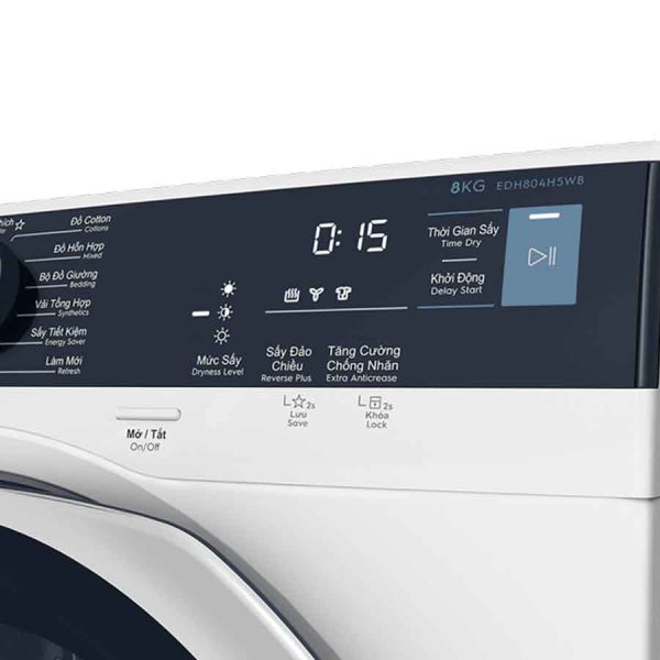 Máy Sấy Bơm Nhiệt Electrolux 8 Kg EDH804H5WB được trang bị chức năng giảm nhăn Reverse Tumbling, giúp quần áo của bạn giữ được vẻ mịn màng và không nhăn sau quá trình sấy. Chức năng này hoạt động bằng cách lồng giặt chuyển động theo hướng đảo chiều xoay tròn nhẹ nhàng. Điều này giúp giữ cho áo quần không bị rối và giảm nhăn đáng kể, kết quả là quần áo ít nhăn hơn, giúp tiết kiệm thời gian và công sức trong việc ủi áo quần sau khi sấy.