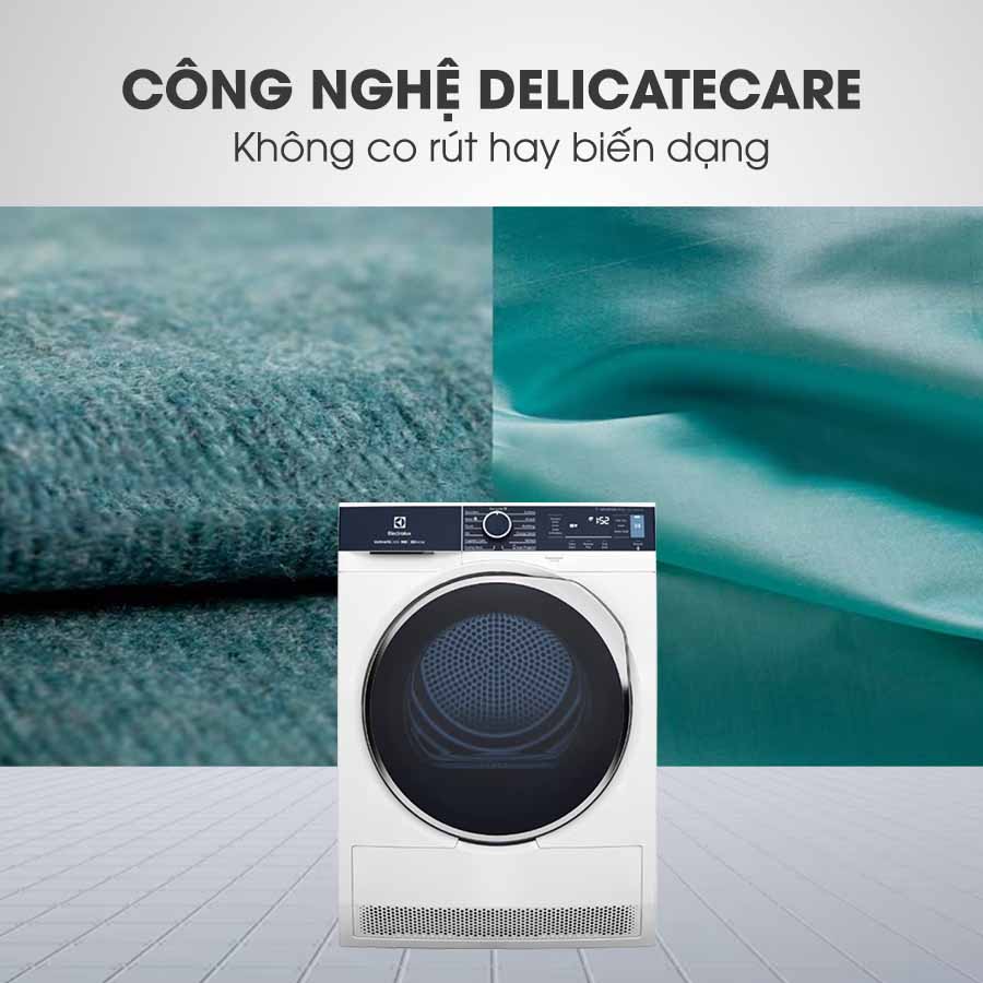 Máy sấy bơm nhiệt Electrolux EDH903R9WB được trang bị công nghệ DelicateCare, công nghệ này cho phép thiết bị tự điều chỉnh nhiệt độ và chuyển động để bảo vệ quần áo cho chất vải mỏng manh, đồng thời giảm tình trạng co rút hay xoắn. Điều này giúp giữ cho quần áo luôn trong tình trạng tốt và bền đẹp sau khi sấy.