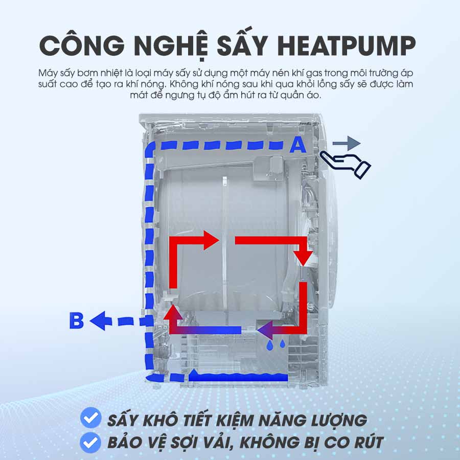 Công nghệ bơm nhiệt giúp giảm sức nóng gây hại cho sợi vải, đồng thời tiết kiệm điện hiệu quả lên đến 50% so với dòng máy truyền thống