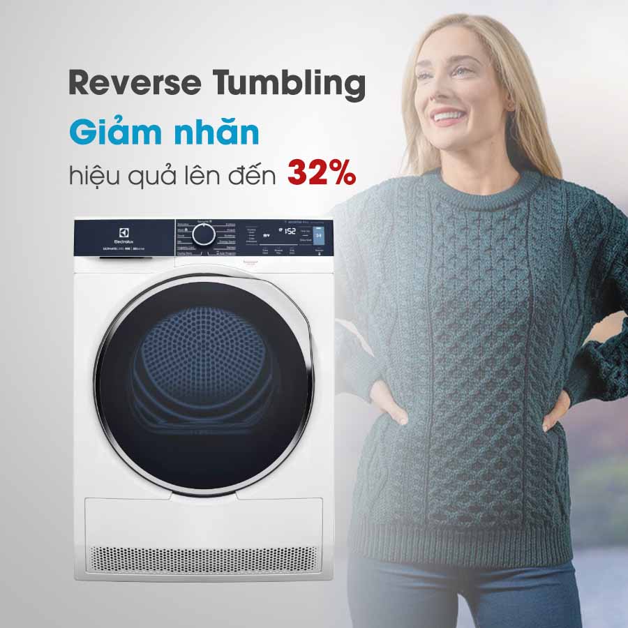 Chức năng Reverse Tumbling có cơ chế chuyển động luân phiên trong quá trình sấy, giúp quần áo giảm nhăn đến 32%