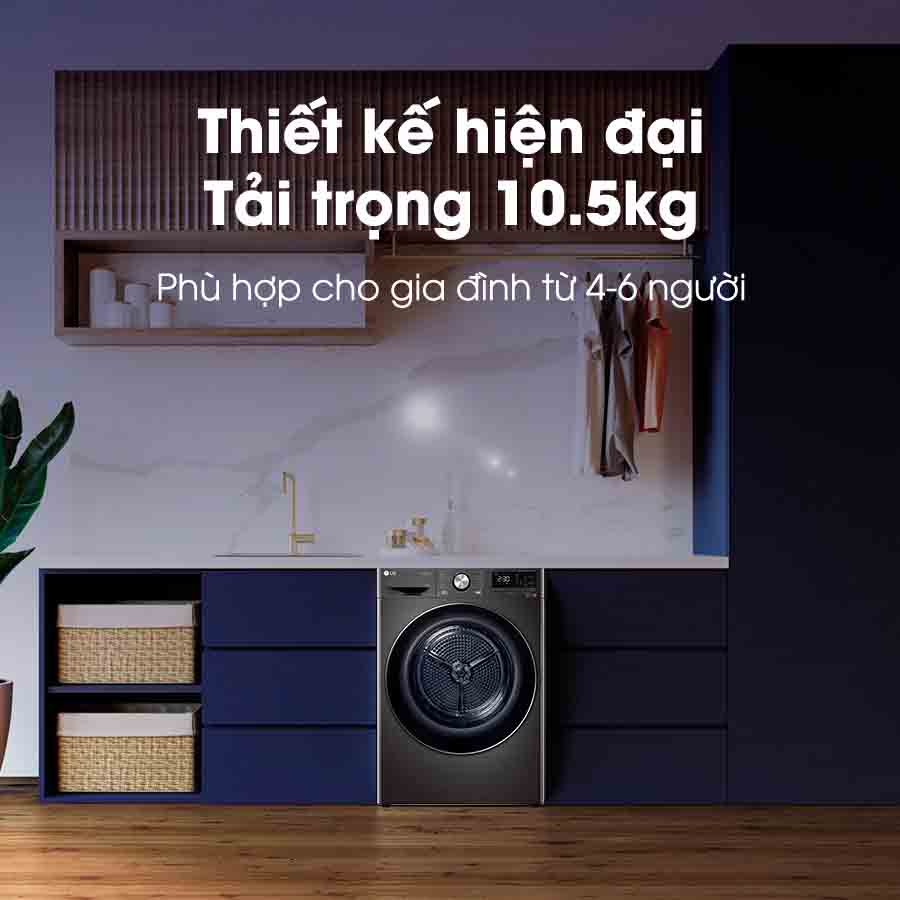 Với khối lượng sấy lên đến 10.5kg, thì chiếc máy sấy bơm nhiệt LG sẽ phù hợp với gia đình có từ 5-7 thành viên, tùy thuộc vào mức độ sử dụng và nhu cầu.
